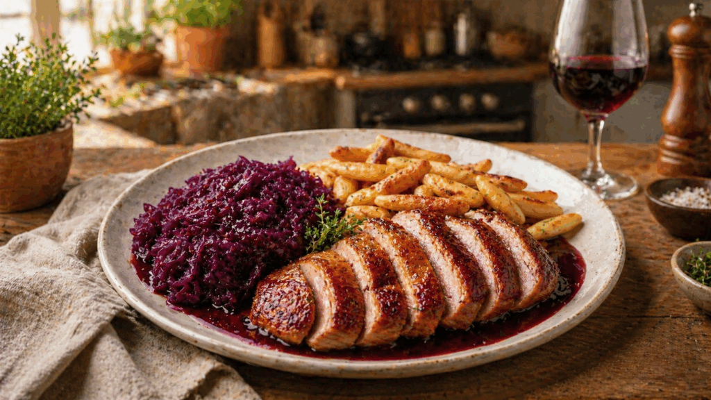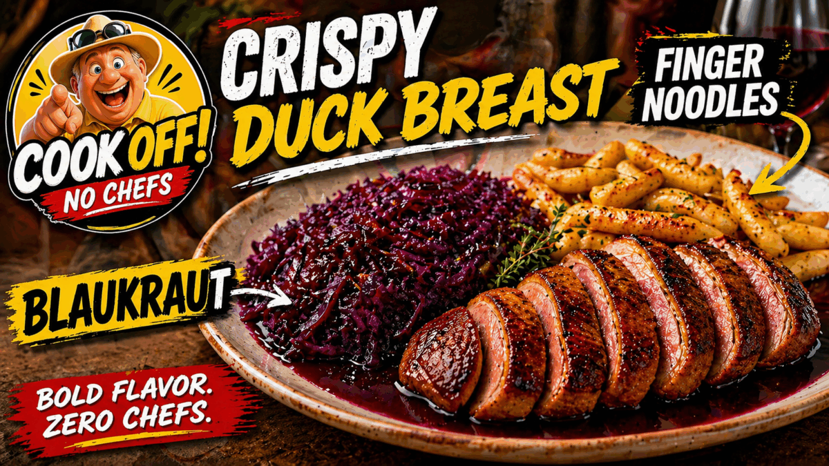 A proper comfort cook today — crispy duck breast, sweet and tangy German red cabbage (Blaukraut), and golden fried Fingern Nudeln. Simple ingredients, big flavour, and one of those meals that feels a bit special without being complicated.