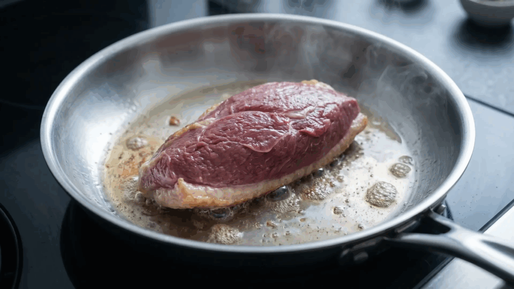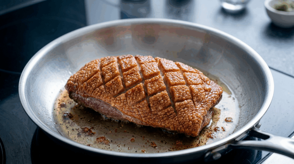 - Start duck in a cold pan — this is the secret to crispy skin